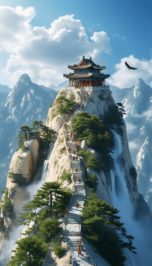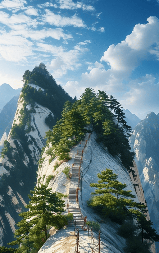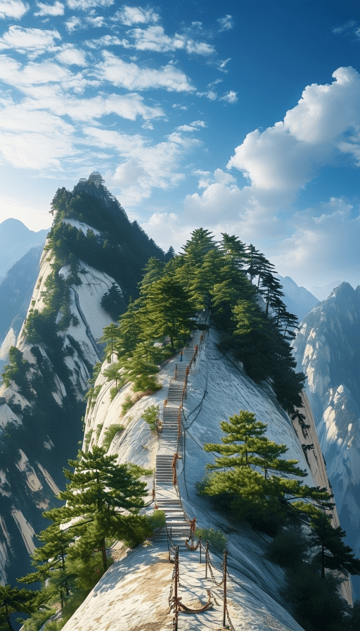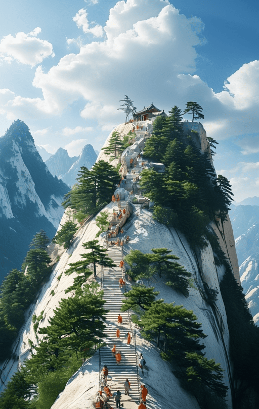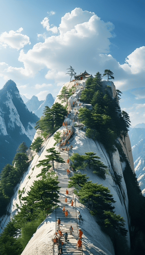 1 DayIn the morning, the tour guide will gather after picking up all the guests and take a bus to Huashan Scenic Area. According to the water classics, it looks like a flower from a distance. In ancient Chinese, flowers and flowers are universal, hence the name Huashan. Huashan Mountain, known as Xiyue Mountain in ancient times and Taihua Mountain in elegance, is one of the birthplaces of Chinese civilization. According to scientific research, 3 billion years ago, Huashan was a sea of Wang Yang. Due to the continuous movement of the earth's crust, magma spewed out and formed a thick sedimentary rock layer. Under the continuous extrusion of the earth's crust, it rose as a whole, forming the picturesque Huashan Mountain. Huashan Mountain consists of a whole granite with five main peaks, namely, Chaoyang in Dongfeng, Lotus in Xifeng, Wild Goose in Nanfeng, Yuntai in Beifeng, Jade Girl in Zhongfeng, and more than 70 peaks and 4 canyons around it. Among the five mountains, it is known as the first mountain in the world.