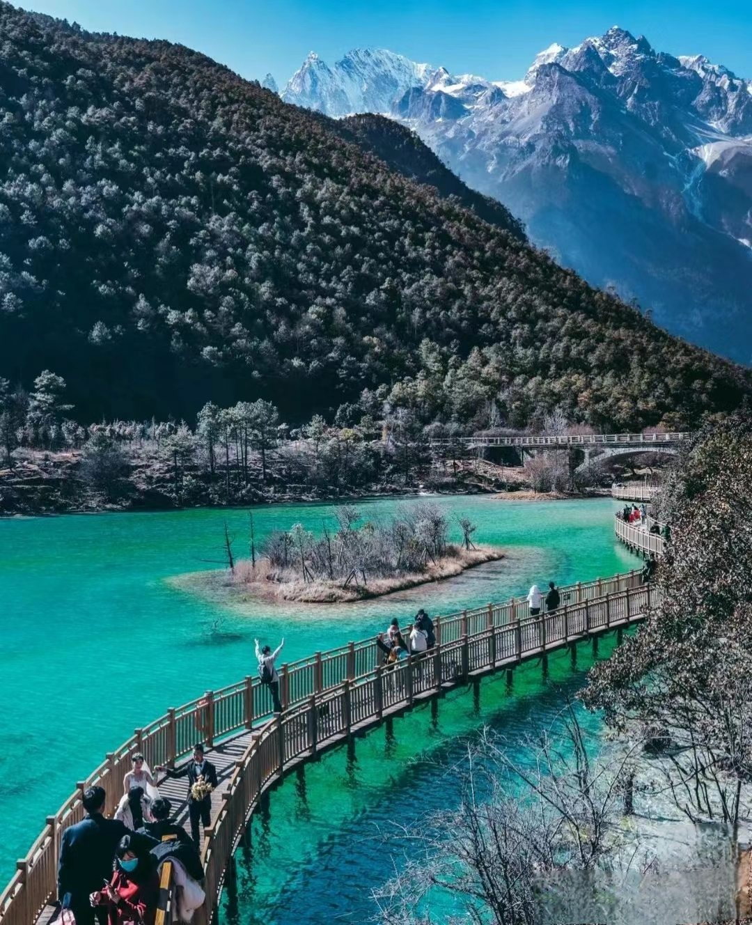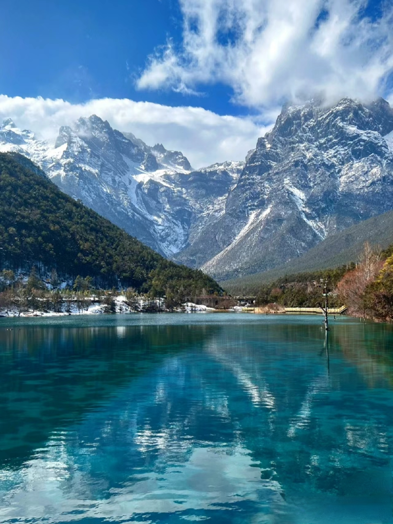Then take a bus to Lijiang and visit the [Black Dragon Pool]. The park is located at the foot of Xiang Mountain in the north of the ancient city. Ascend from the large waterwheel upstream, and you will find a crystal-clear spring pool—this is the Black Dragon Pool. Here, you can photograph the beautiful Jade Dragon Snow Mountain, admire many ancient buildings within the courtyard, and even climb up Xiang